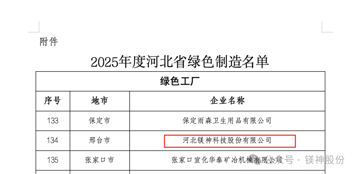 2025年9月8日,河北省工業(yè)和信息化廳正式公布了2025年河北省綠色制造名單。河北鎂神科技股份有限公司(以下簡稱“鎂神科技”)憑借在綠色制造、節(jié)能降耗、清潔生產(chǎn)等方面的突出表現(xiàn),成功入選“2025年度河北省綠色制造名單”!這是公司積極踐行綠色發(fā)展理念、扎實推進綠色體系建設(shè)取得的重大成果,也是對鎂神科技綠色制造水平和可持續(xù)發(fā)展能力的認可!